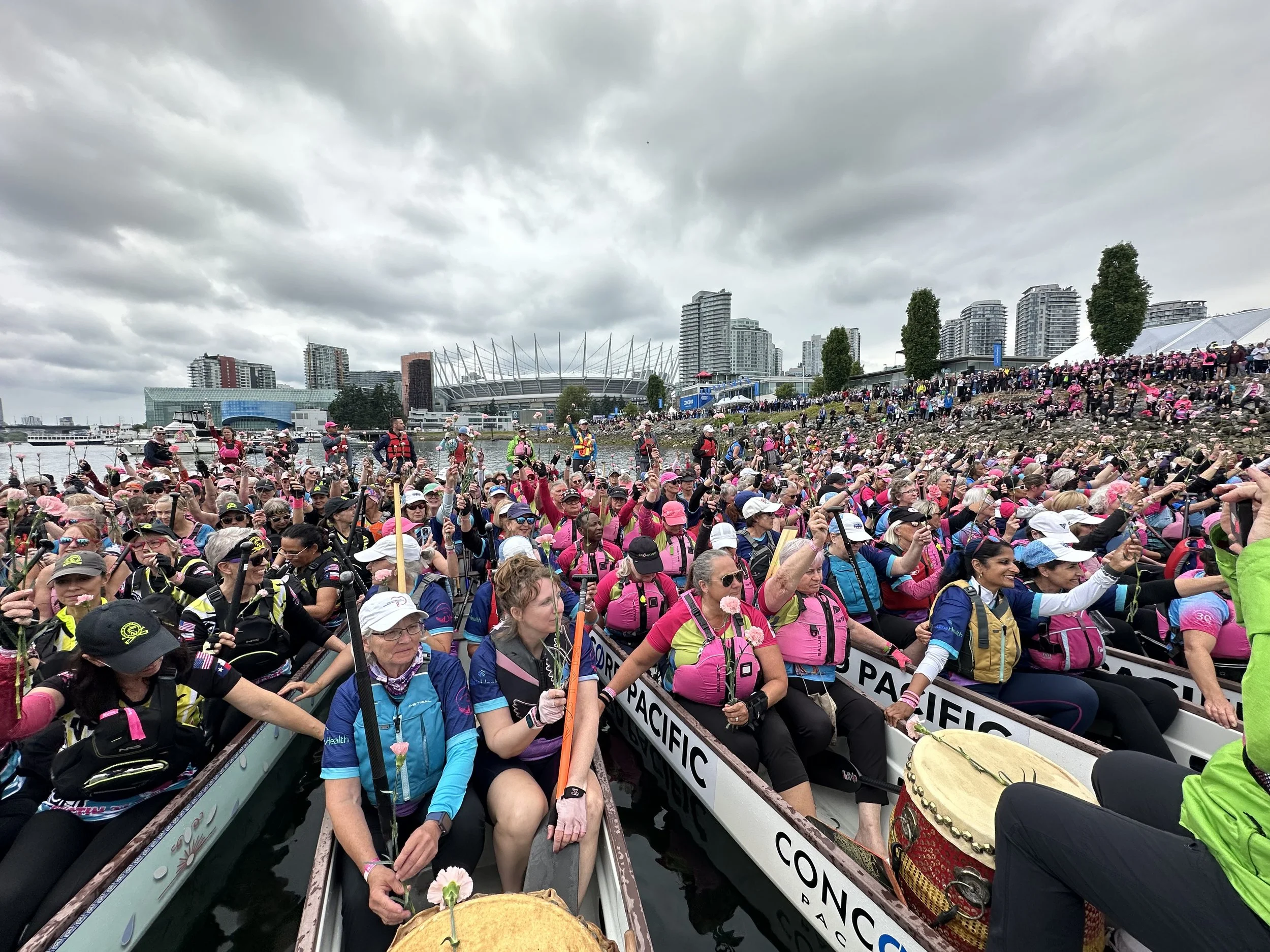 Two teams of Dragon Divas, all with at least 2 years paddling experience, traveled to Vancouver, British Columbia, to compete in the Concord Pacific Dragon Boat Festival June 20-22, 2025. With 220 teams registered, this festival is the largest dragon boat festival in North America. Of these, 33 teams competed in the Breast Cancer Division 500 Meter races over the 2 days. Sporting their new 20th Season jerseys, Dragon Divas-Hope qualified for the Grand Final, and placed 5th overall of 33 BC teams, with a time of 2:27 minutes, while Dragon Divas-Courage qualified for the B Final and placed 14th overall in the BC Division, with a time of 2:38 minutes.